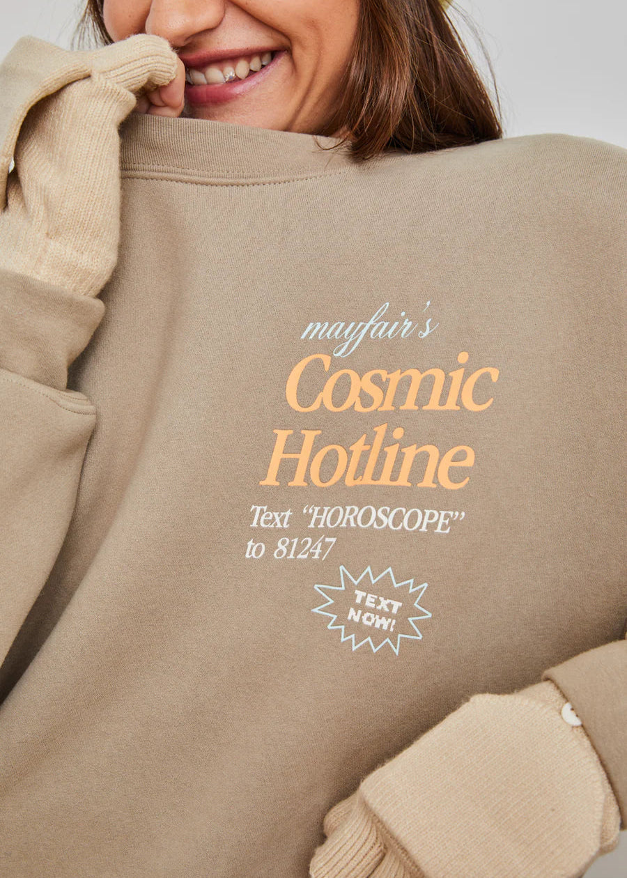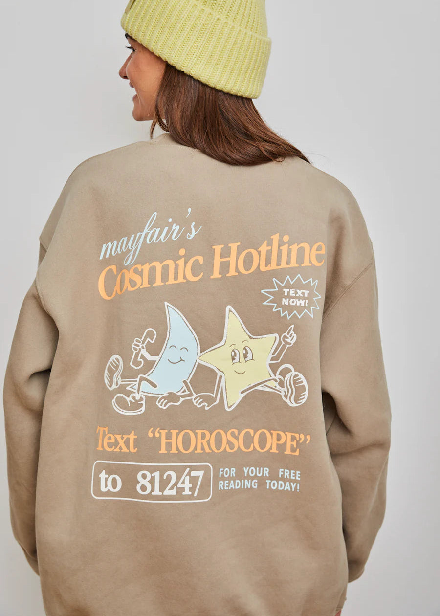 The Mayfair Group’s Cosmic Hotline Crewneck is here to remind you that the universe is listening. Made from soft fleece with a relaxed fit, it features whimsical graphics and affirmations that channel cosmic connection and self-love. Wear it when you need comfort, clarity, or just a little interstellar energy.