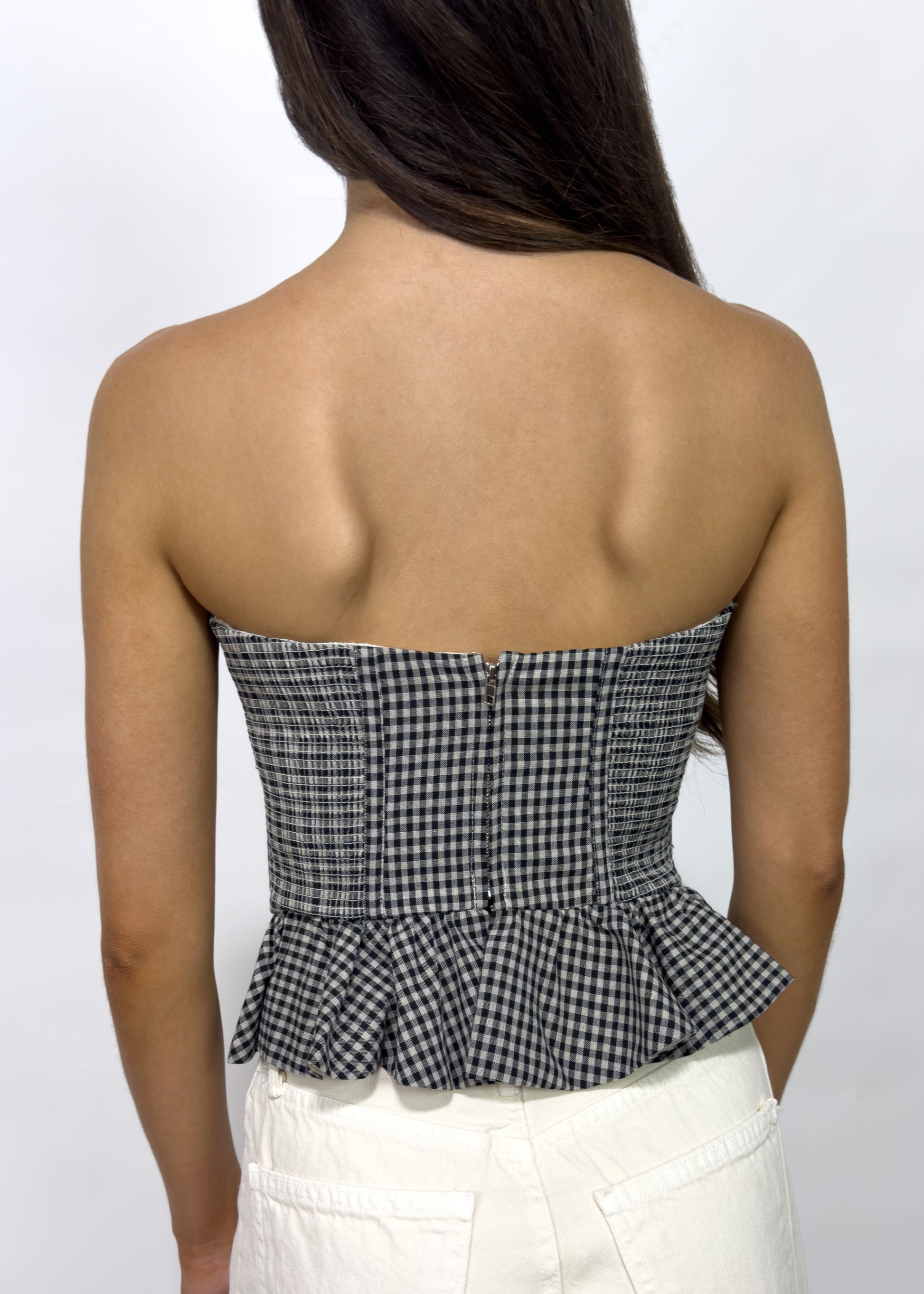 Bring some structure to your summer style with this gingham corset top. Featuring a flattering strapless neckline, curve-hugging bodice, and playful peplum hem, it’s the perfect mix of tailored and feminine. Pairs effortlessly with high-rise denim, skirts, or trousers for a polished yet easygoing look.